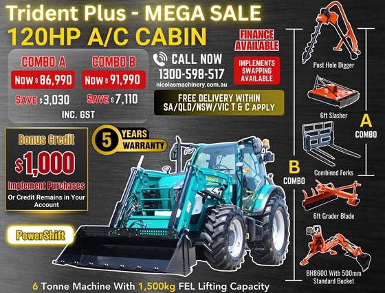 COMBO B: TRIDENT PLUS 110HP Powershift 4WD A/C cabin tractor with FEL 4in1 bucket + backhoe BH8600 with 500mm standard bucket + 6FT slasher + 6FT grader blade with ripper + post hole digger with 9 inch auger + combined forks (pallet + hay) for only $76,990 inc. GST
