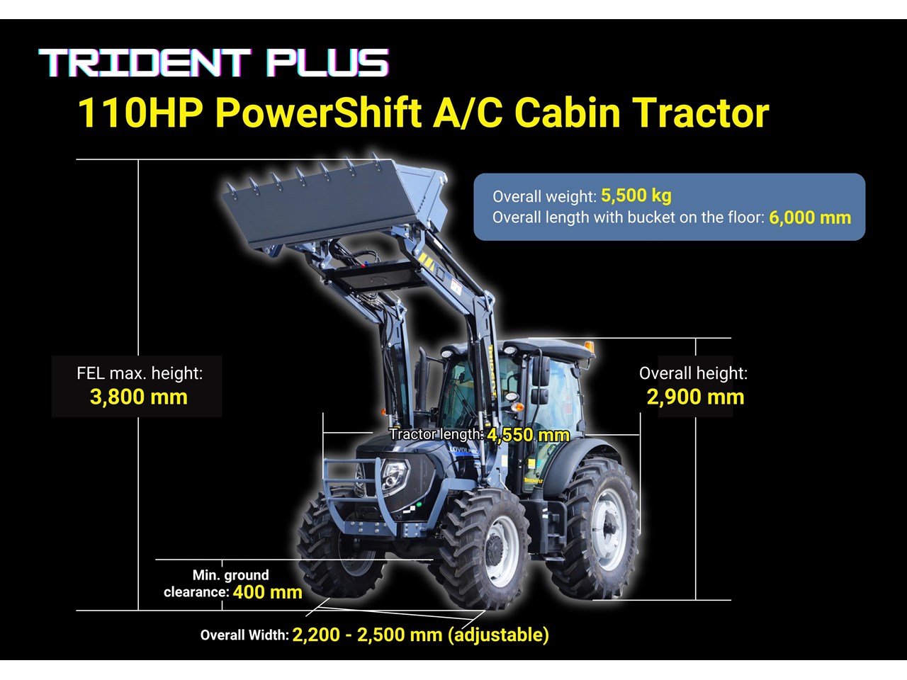2025 TRIDENT PLUS POWERSHIFT MODEL 110HP POWERSHIFT 4WD A/C CABIN TRACTOR WITH 4IN1 BUCKET COMBO DEAL 5 YEARS LABOUR AND PARTS WARRANTY AUSTRALIA WIDE DELIVERY & SUPPORT